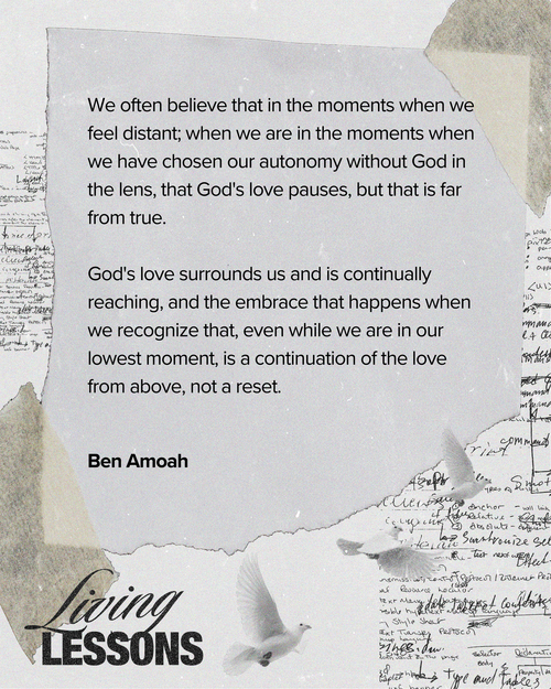 We often believe that in the moments when we feel distant; when we are in the moments when we have chosen our autonomy without God in the lens, that God's love pauses, but that is far from true. God's love surrounds us and is continually reaching, and the embrace that happens when we recognize that, even while we are in our lowest moment, is a continuation of the love from above, not a reset. God's love happens at the beginning of our story, it does not start then stop then start again. It starts at the beginning and continues through to the end and beyond. May we learn to love others around us in that manner. May we reform the narrative, that when people around us, people we care about, make choices that appear to be distant from God, may we rest assured that the love from God has not paused, and God’s love is evident in the fact that we can make any choice.