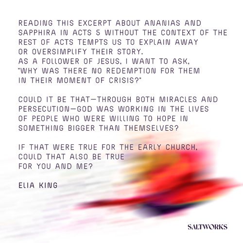 I must confess that my inclination when I bump up against a story like this is to close the book. End the chapter. But the reality is that we don’t often get that opportunity because real life is more complex. Some of our stories are complete in and of themselves, but others need a broader perspective for a better understanding. Reading this excerpt about Ananias and Sapphira without the context of the rest of Acts tempts us to explain away or oversimplify their story. As a follower of Jesus, I want to ask, “why was there no redemption for them in their moment of crisis?” But in their story—as in our own—we often do not get the privilege of knowing the end from the beginning.