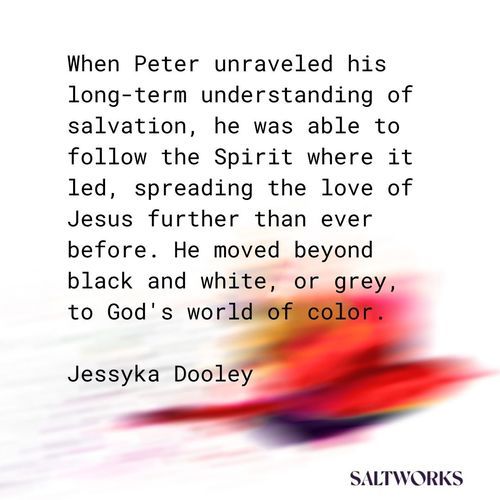 I think we often let certain thoughts weave so intricately into our daily lives that we miss out on something even better. When Peter unraveled his long-term understanding of salvation, he was able to follow the Spirit where it led, spreading the love of Jesus further than ever before. He moved beyond black and white, or grey, to God's world of color. I love how the New Living Translation shares Peter's words describing his interaction with a group of Gentiles, "As I began to speak, the Holy Spirit fell on them, just as he fell on us at the beginning. Then I thought of the Lord's words when he said, 'John baptized with water, but you will be baptized with the Holy Spirit. And since God gave these Gentiles the same gift he gave us when we believed in the Lord Jesus Christ, who was I to stand in God's way?'