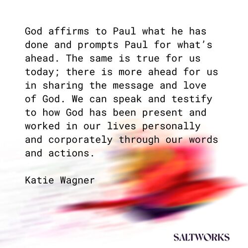 God affirms to Paul what he has done and prompts Paul for what’s ahead. The same is true for us today; there is more ahead for us in sharing the message and love of God. We can speak and testify to how God has been present and worked in our lives personally and corporately through our words and actions. And we can prepare for what’s to come and what God is calling us to do.